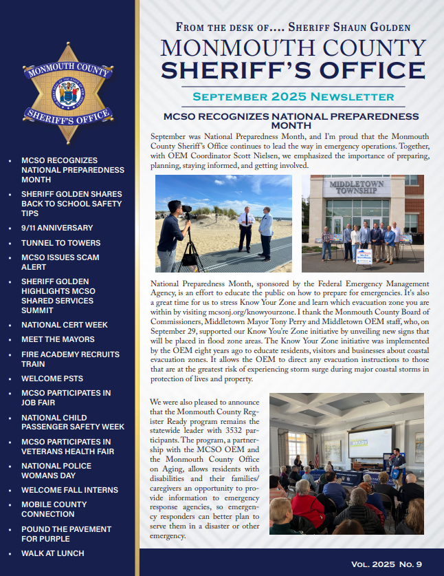 It is a pleasure to welcome you to the Monmouth County Sheriff’s Office website. This site provides up-to-date information and 24/7 access for residents within our community. It has been designed to provide the community with a comprehensive guide to the Sheriff’s Office. Whether you seek specific information or have just stopped by to browse, we invite you to explore our site and learn more about our office’s numerous responsibilities and duties.