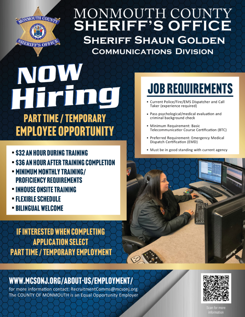 The Monmouth County Sheriff’s Office is always looking for additional 9-1-1 Telecommunicators for our growing Dispatch Center located in Freehold, NJ.