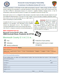 The Monmouth County Office of Emergency Management is launching a new registration portal for residents with access and functional needs. The Monmouth County Emergency Vulnerability & Assistance Coordination System (E.V.A.C.S.) initiative is voluntary and free program designed to assist first responders and emergency planners in identifying those residents that may need assistance in evacuating in advance of an emergency and so that emergency management may develop the necessary plans to support those needs. It will also aid emergency planners in the development of shelter plans for those residents with Access and functional Needs. The information collected through a secure on-line portal is only accessible to emergency management and first responders.