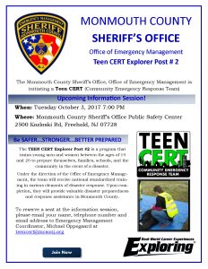 Sheriff Golden invites interested teens and their parents to an informational session held on Tuesday Oct. 3, 2017 at 7:00 PM at the Monmouth County Sheriff’s Office Public Safety Center, 2500 Kozloski Road Freehold, NJ 07728. Interested participants are asked to please RSVP for this event by emailing teencert@mcsonj.org or by calling 732-431-7400 ext. 1801.