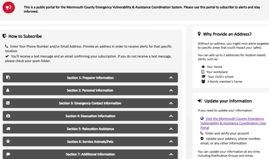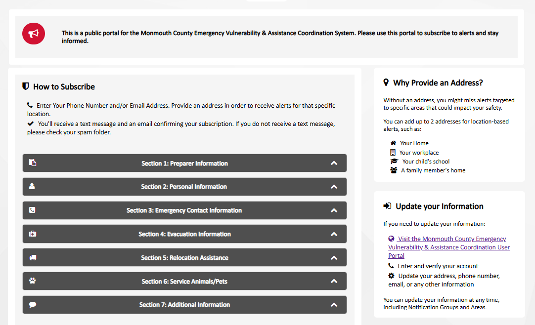 The Monmouth County Emergency Vulnerability & Assistance Coordination System (E.V.A.C.S.) is a voluntary and free portal that allows residents with access and functional needs to provide confidential information. As a result, county and local first responders can plan for evacuations and sheltering operations ahead of an emergency. The system will also assist emergency management officials in developing effective evacuation and sheltering plans for residents.